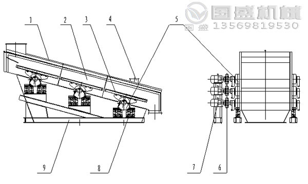 2.采用多段筛面的结构设计,和普通的振动筛结构方式不同,它不是整体参与振动的,筛机的侧板、顶盖、底座都是固定部分,只有筛网和激振器轴承参与振动,所以是分段筛分、筛机整体不振动而筛网振动的结构方式。